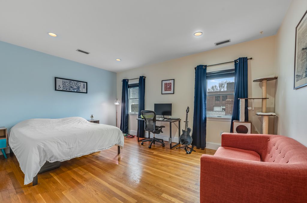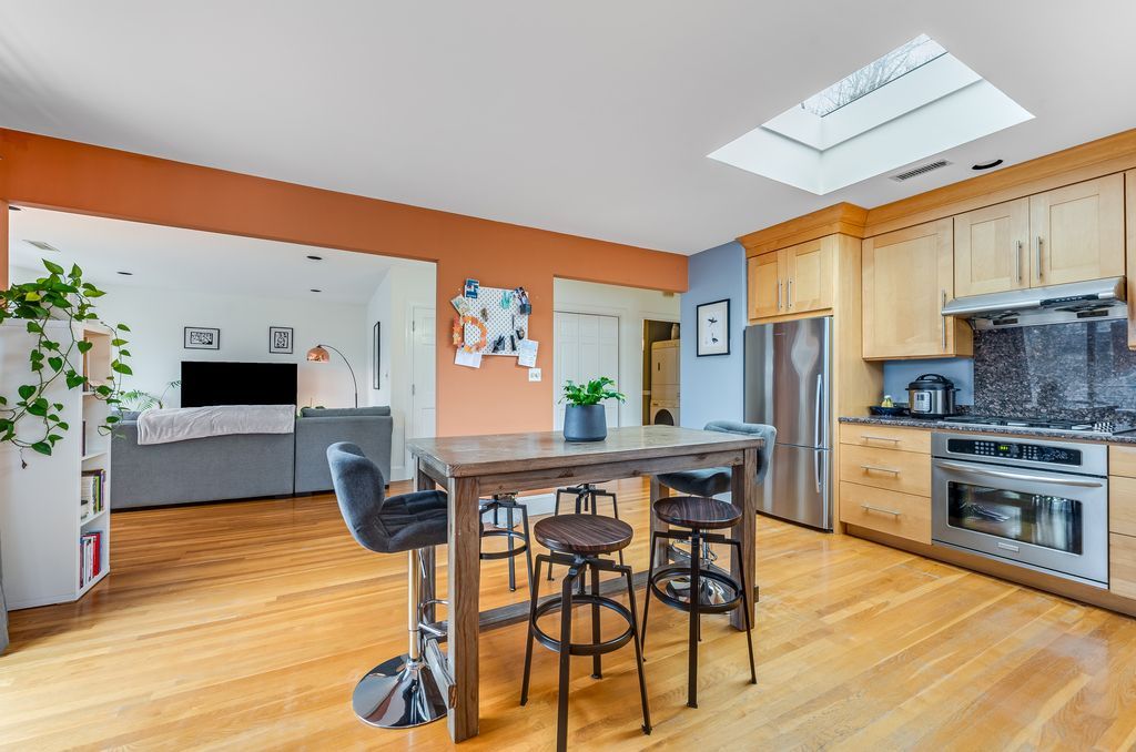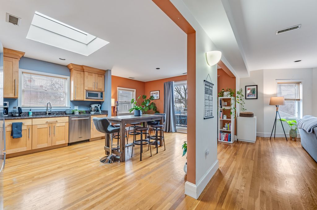 Perched on the top floor, this bright and inviting 2-bedroom condo offers an exceptional blend of space, light, and location in the sought-after Riverside neighborhood, just minutes to Harvard Square, Harvard University, the Charles River, and the Red Line MBTA. The well-designed layout separates two oversized bedrooms from the main living areas for added privacy. A sun-filled living room with front window bay flows into a dining area with access to a private balcony. The large eat-in kitchen features a skylight, window over the sink, stainless steel appliances, and granite countertops. Additional highlights include a full bath with double vanity, half bath + in-unit laundry, custom closets, A/C and storage. Enjoy an oversized common deck, garage parking for one car, and a recently painted exterior (2025), all set on a charming tree-lined side street near parks, shops, dining, and the vibrant energy of Harvard Square. Rare offering.
